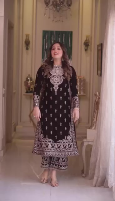 A stunning 3-piece suit crafted from premium fabric, adorned with intricate embroidery that exudes timeless grace.