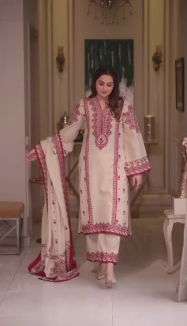 A stunning 3-piece suit crafted from premium fabric, adorned with intricate embroidery that exudes timeless grace.